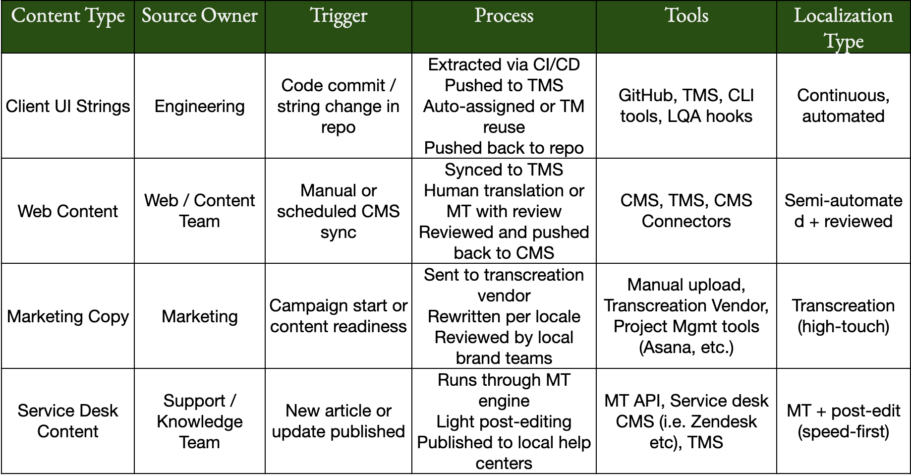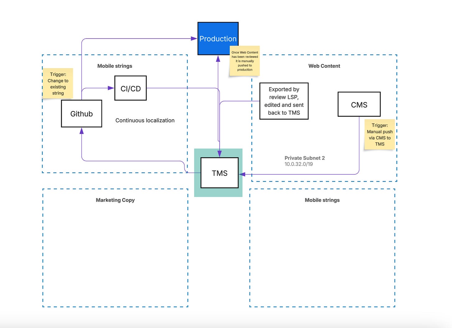 Ok, here is a high level *incomplete* example of how you could start mapping out the infrastructure and architecture of an imagined localization flow (which I created in Lucidchart, based on the above table):